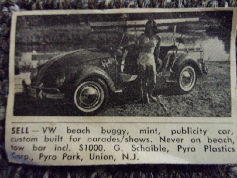 My question was answered in 1966 when, in a classified ad in the back of a car magazine (the specific name of which I have forgotten), the very same Volkswagen beach buggy was offered for sale, in a black and white ad that included a photograph of the vehicle. Thus I learned that there was an actual Volkswagen beach buggy, and that apparently Pyro had it built or modified for promotional purposes.