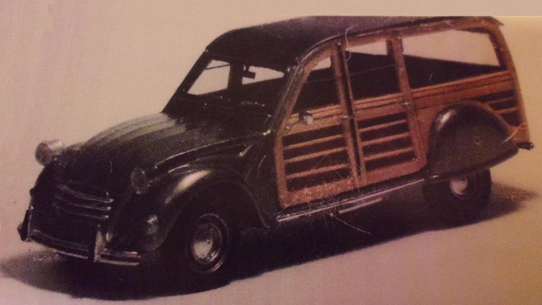 Conrad was a "car guy". He built and/or modified models of various vehicles, mostly station wagons, but not only wood paneled wagons. The Oldsmobile "Nomad" style is likely a diecast basis, as was the International. The Citroen likely began as a plastic 2CV, and the Plymouth I would guess to have been a resin based model. See below: