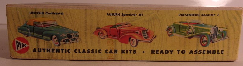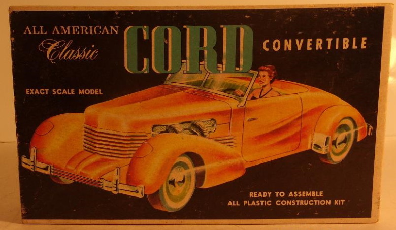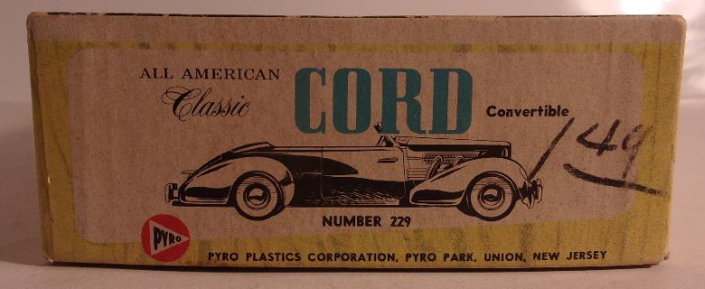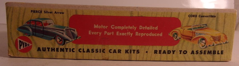 In the years immediately following WWII, classic cars were just old cars, and were a dime a dozen; meaning they could be purchased inexpensively as used cars. At the same time, scale models of antique and classic cars were coming into their own, and by the early fifties plastic, such as it was at the time, was supplanting wood as the material of choice for all types of scale models. In the year 1955, two Cords became available as plastic scale model assembly kits. Gowland & Gowland, by way of Revell, released a 1/32 scale 1936 Cord 810 convertible phaeton sedan, the model measured approximately 5 inches long. It represented a non supercharged car, thus lacking the external exhaust pipes we have become accustomed to seeing on many Cords of that era. [The external exhaust were on the supercharged cars, and that option arrived in 1937 on the Cord 812.] The raised convertible top was an integral part of the body so that was the model builders only option. The other Cord model kit released in 1955 was the '37 812 convertible phaeton sedan, listed as 1/24 scale, by Pyro Plastics Corp., of New Jersey. This model measured approximately 8 inches when assembled, and represented an open car, with the top down, a supercharged engine with external exhaust pipes, and an opening hood. Our focus here is the Pyro kit, and more specifically the intriguing box art of what is believed to be the first issue of the kit. First object of interest is the large illustration on the box top. It depicts an 812 convertible coupe; a car with no rear seat, a body style Cord called a Sportsman, yet the model contained within the box is is not a Sportsman, but the convertible with a rear seat, the Phaeton Sedan. Both ends of the box correctly depict the contained model, the Phaeton Sedan. Yet in an illustration on the side of the box, the Sportsman (convertible coupe) again erroneously appears. In the years since 1955 we have come to know that the other models in the Pyro "1/24 scale" series are the '35 Auburn 851 Speedster, and the '48 Lincoln Continental Cabriolet. Both of them are correctly depicted o the box sides, and both - like the Cord - have been reissued several times. Then it gets interesting. In addition to the Cord Sportsman, the Auburn and the Continental, there also appear on the sides of the box, illustrations of two cars which presumably were under consideration for production, but to the best of my knowledge, were never made: a '33 Pierce Arrow Silver Arrow sedan, and a Duesenberg J roadster. Both of which, I'm confident, would have been welcomed by many modelers. We are left to wonder why they were not made. Thus, the box art is actually more interesting in some ways, than the model it contained. The '37 Cord Convertible is the one Cord model most represented in both plastic kits, and assembled diecast metal models. Fortunately, other body styles and other years have since also become available in various scales and mediums, including resin conversion bodies, and fully assembled models. The Pyro kit from 1955, though not the best representation of the car, was indeed the first readily available scale model of the front wheel drive Cord, and with the box art of that first release, arguably also the most interesting. Box art: