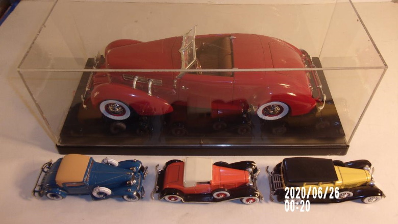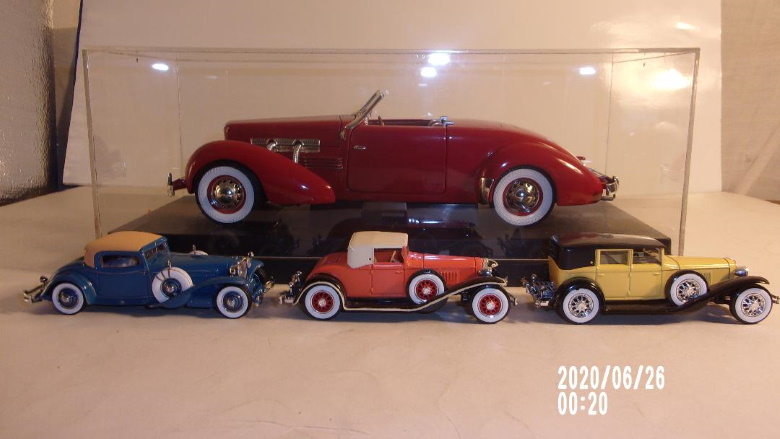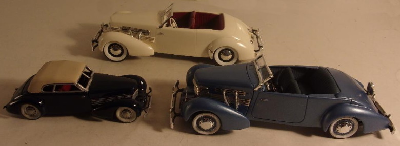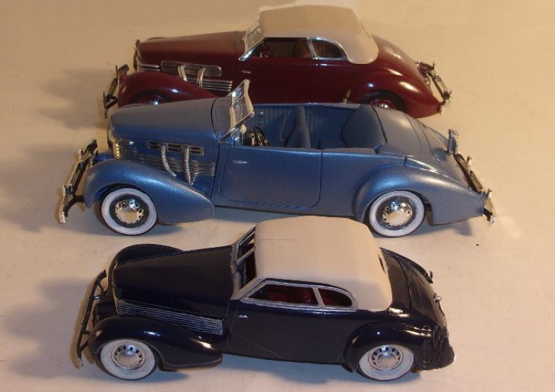 Plastic models: Lower: Revell 1/32 1936 Cord 810. Center: Pyro 1/24 1937 Cord 812. Top: Monogram 1/24 '37 Cord 812. Plastic models: Left: Revell '36 810. Right: Pyro '37 812. Rear: Monogram '37 812. Front: Three 1/43 scale 1929 -1931 Cord L29 models. Rear 1/18 scale '37 Cord 812 Sportsman model.