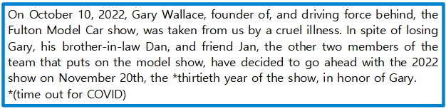 thinking that he or she is walking through a museum. For this, the “twentieth anniversary” show, in addition to the usual 1st through 3rd place awards in the seventeen categories, and the many special awards given annually, the team decided to do something which they hadn’t done before. As was explained at the end of the awards presentations: with three judges, each may not always agree with the other two. Despite the usual consensus which results in a 1st, 2nd, or 3rd place award, there are times when one of the judges feels that a particular model “speaks” to him for a reason known only to himself. So this year, (adding to the fun factor previously mentioned) they handed out three unique prizes, each selected by only one judge himself: The “Gary Award”, the “Dan Award”, and the “Jan Award”, each went to a deserving modeler, based on what the judge saw in the particular model he had chosen. This unexpected twist was well-received by everyone in attendance, and a good time was had by all! Gary credits his brother-in-law Dan for much of the show’s success, as a result of the hard work and effort he has invested throughout the years. So where will this “best little show no one knows about” be found? Not far from Fulton, At the “Volney Fire Department Barn”, in Volney, NY. Which, by the way, isn’t a barn at all; it is a large, modern structure with two huge areas devoted to the Fulton Model Show, on the last Sunday before Thanksgiving, every November. Get building! Then get out your GPS Navigation and find your way to “The best little show no one knows about”…see you there!