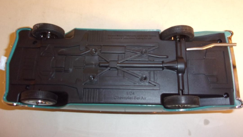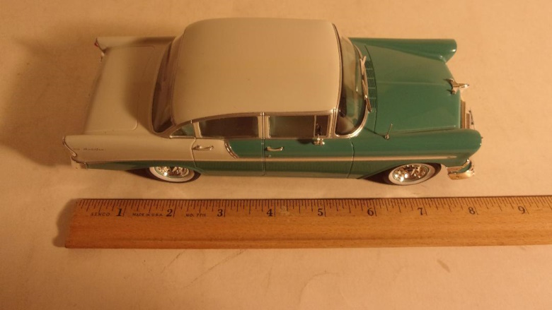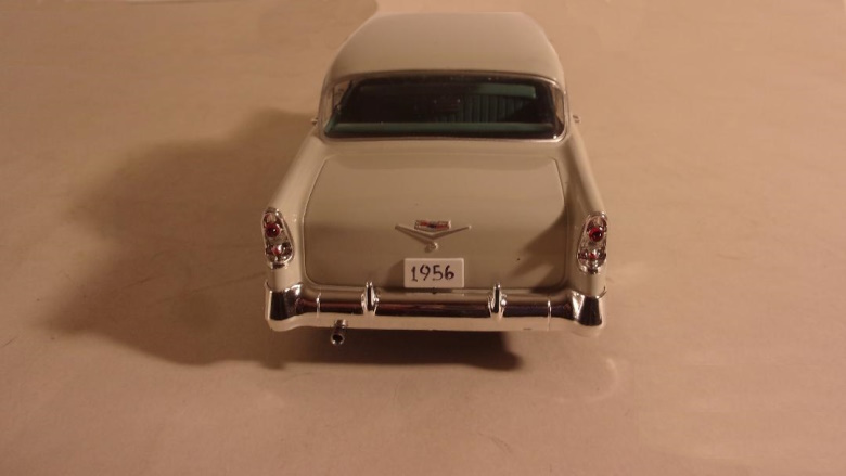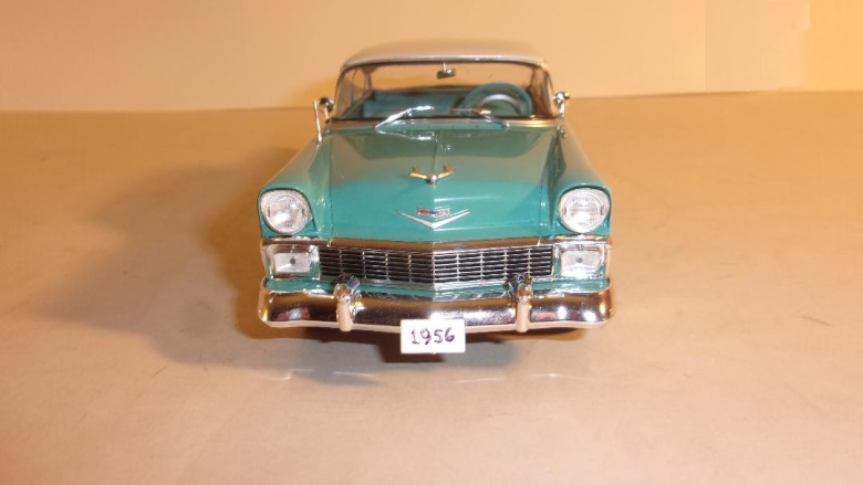 In both 1/24 and 1/25 scale, we have certainly seen more than our fair share of four door sedan models, in both plastic and die cast metal, depicting various police cars. Chevy Caprices and Impalas, Ford Crown Victorias, downsized Dodge Monacos and Plymouth Furys. Some were dressed as specific city or state police agencies, and a few were plain Jane unmarked - yet still obvious - police cars. An addition to the police car ranks that was different from those we had long seen, was the full size '74 Monaco by Greenlight, available as a CHP freeway flier, or a NY State Police pursuit, and in some other guises as well. Until very recently no one offered civilian four door family cars in scale models. Of course the police cars could be painted and built as family cars, but in addition to having to delete spot lights, and bar lights, radios, cages, weapons, and dog dish wheel covers, the cars were usually devoid of chrome trim. From Argentina, of all places, comes a 1956 Chevrolet, top of the line Bel Air, two tone 4 door sedan. It is available in either red and white, or green and white, and is produced by Salvat.